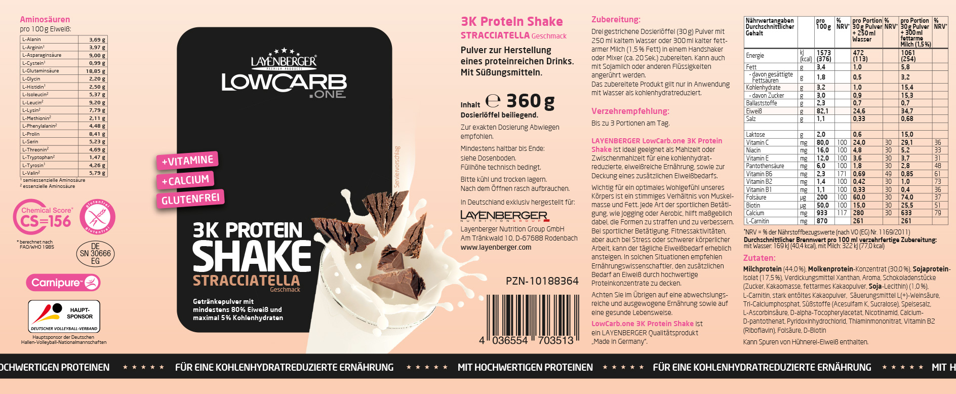 Der Layenberger LowCarb.one 3K Protein-Shake basiert auf den neuesten wissenschaftlichen Erkenntnissen und fein abgestimmten, modernen Rezepturen. Die hohen Chemical Score Werte werden durch den Einsatz sehr hochwertiger Milch-, Molken- und Sojaproteine erreicht, angereichert mit Vitaminen und Calcium. Das bedeutet, dass das Produkt viele hochwertige Eiweiße enthält. Aufgrund der ausgewogenen Zusammensetzung des LowCarb.one Protein-Shakes sind diese auch speziell geeignet zur bestmöglichen Regeneration der Muskeln vor und nach dem Training. Er ist leicht bekömmlich und besonders lecker im Geschmack. Die Shakes eignen sich auch als Teil einer Low-Carb-Diät oder um sich dauerhaft mit wenig Kohlenhydraten zu ernähren.